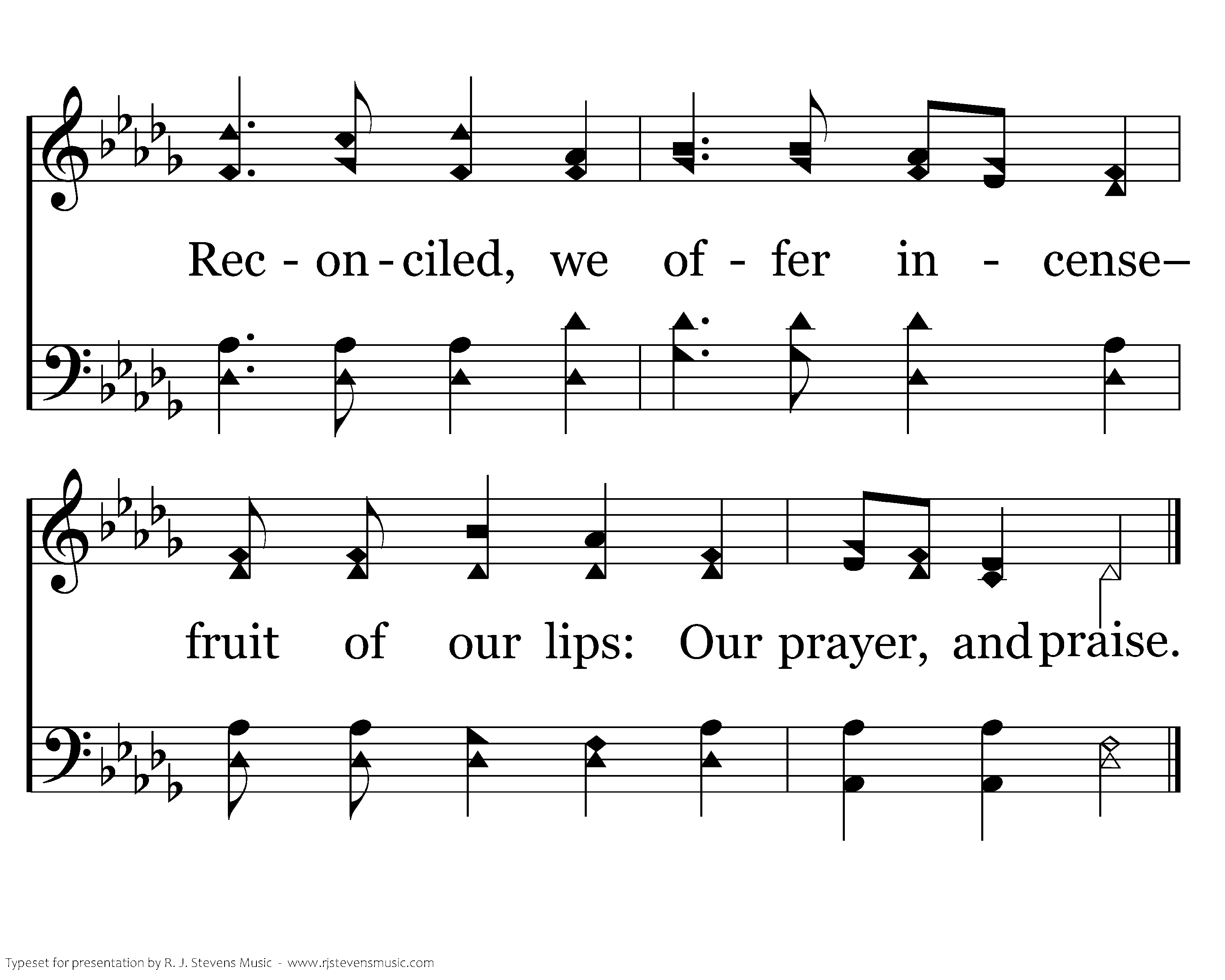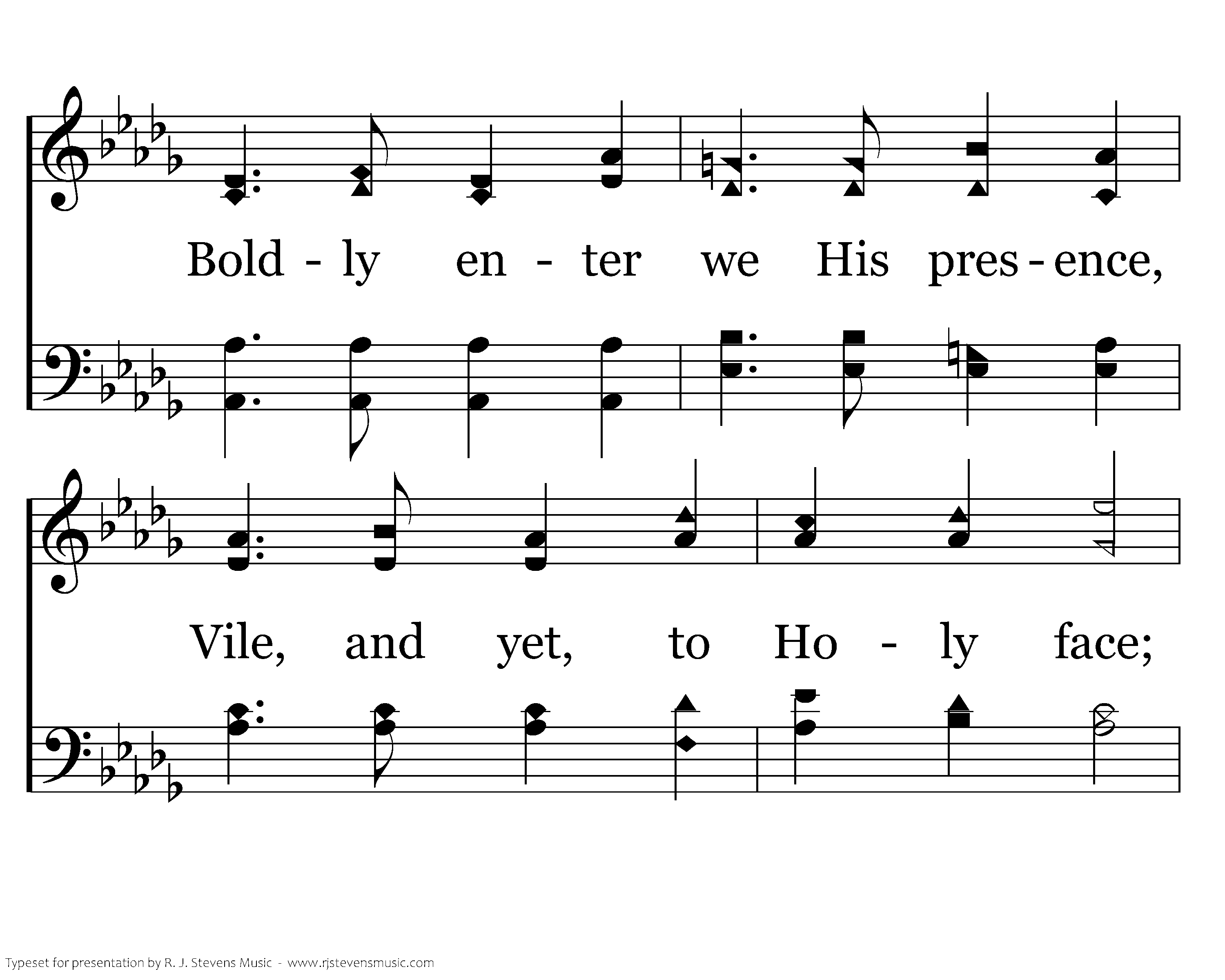 Justice hidden from the living, Son of God hung on man's tree. For hell's prey was heaven smitten, Bruised and grieved, He set men free. Boldly enter we His presence, Vile, and yet, to Holy face; Reconciled, we offer incense– fruit of our lips: Our prayer, and praise.