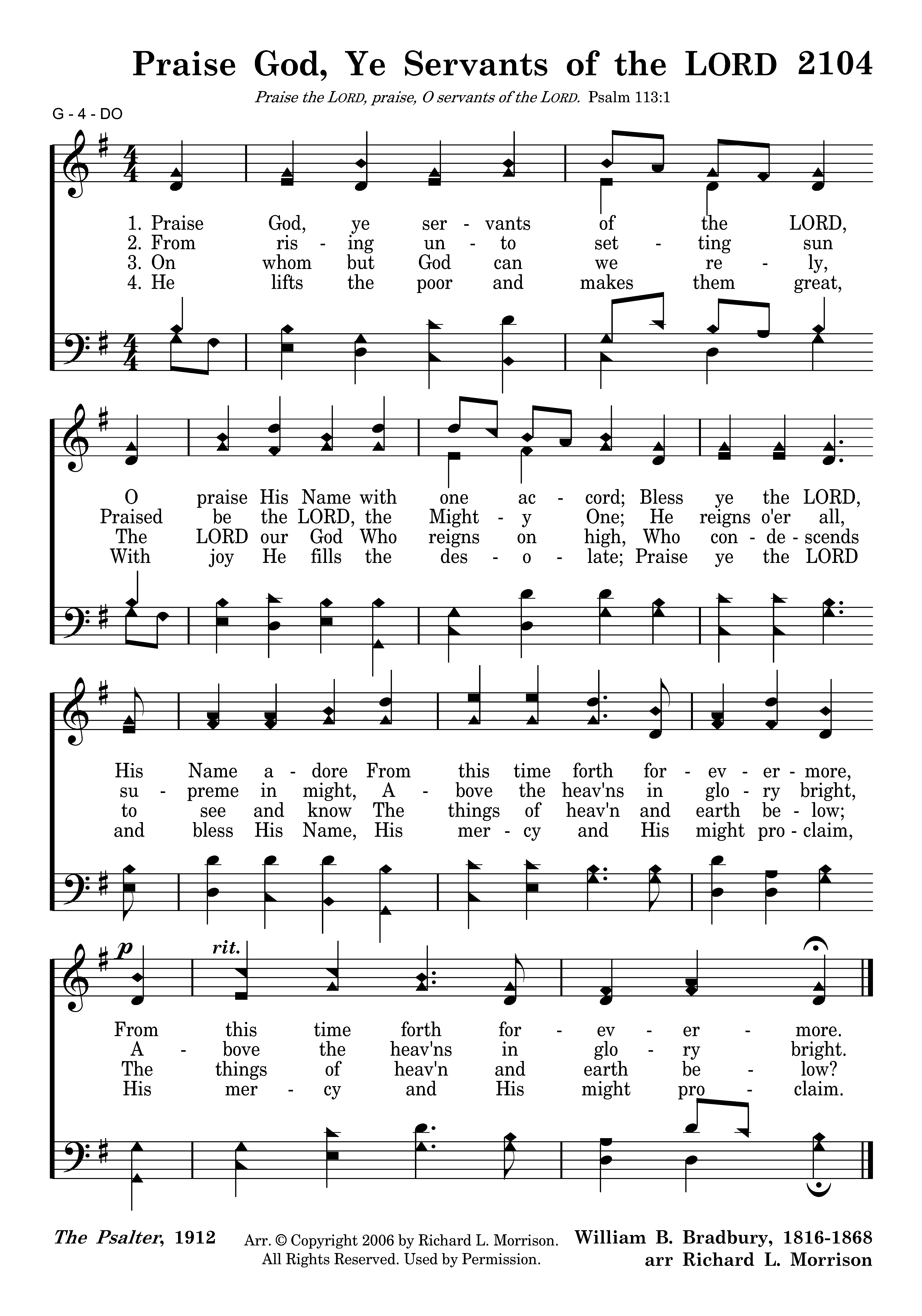 Praise God, ye servants of the LORD, O praise His Name with one accord; Bless ye the LORD, His Name adore From this time forth forevermore, From this time forth forevermore.