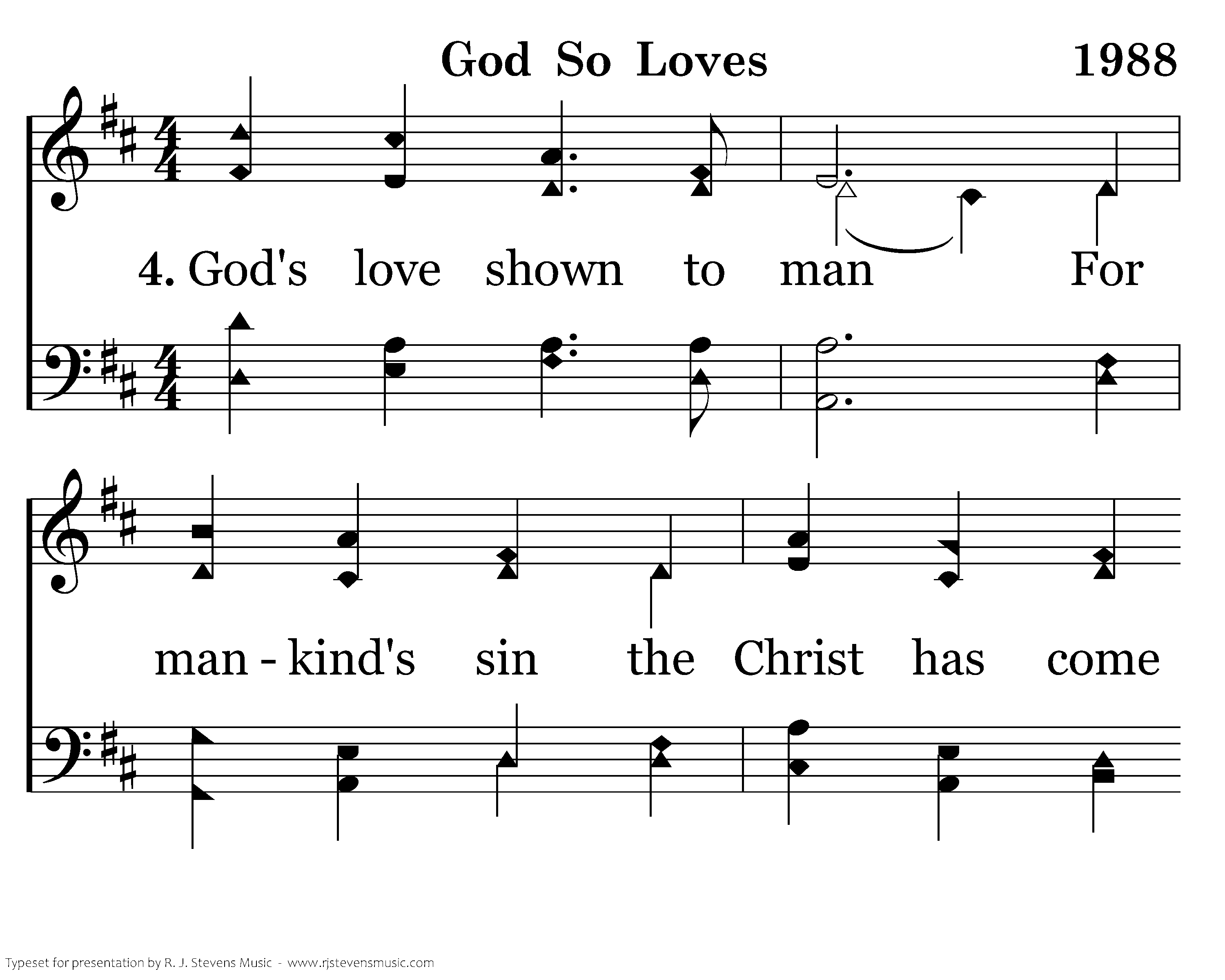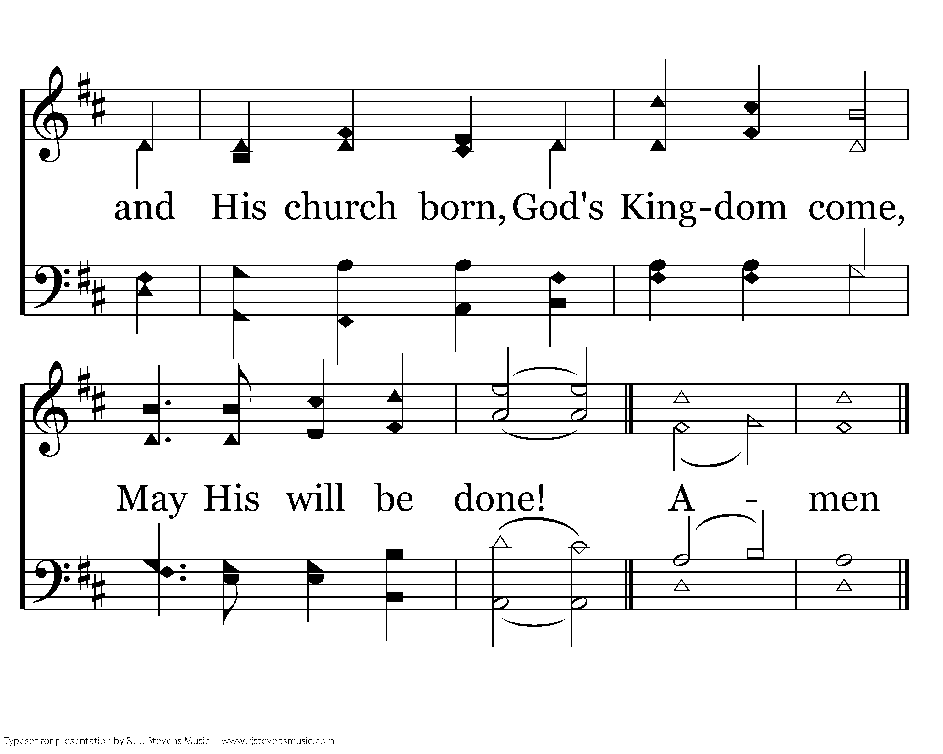God's love shown to man For mankind's sin the Christ has come and His church born, God's Kingdom come, May His will be done! Amen