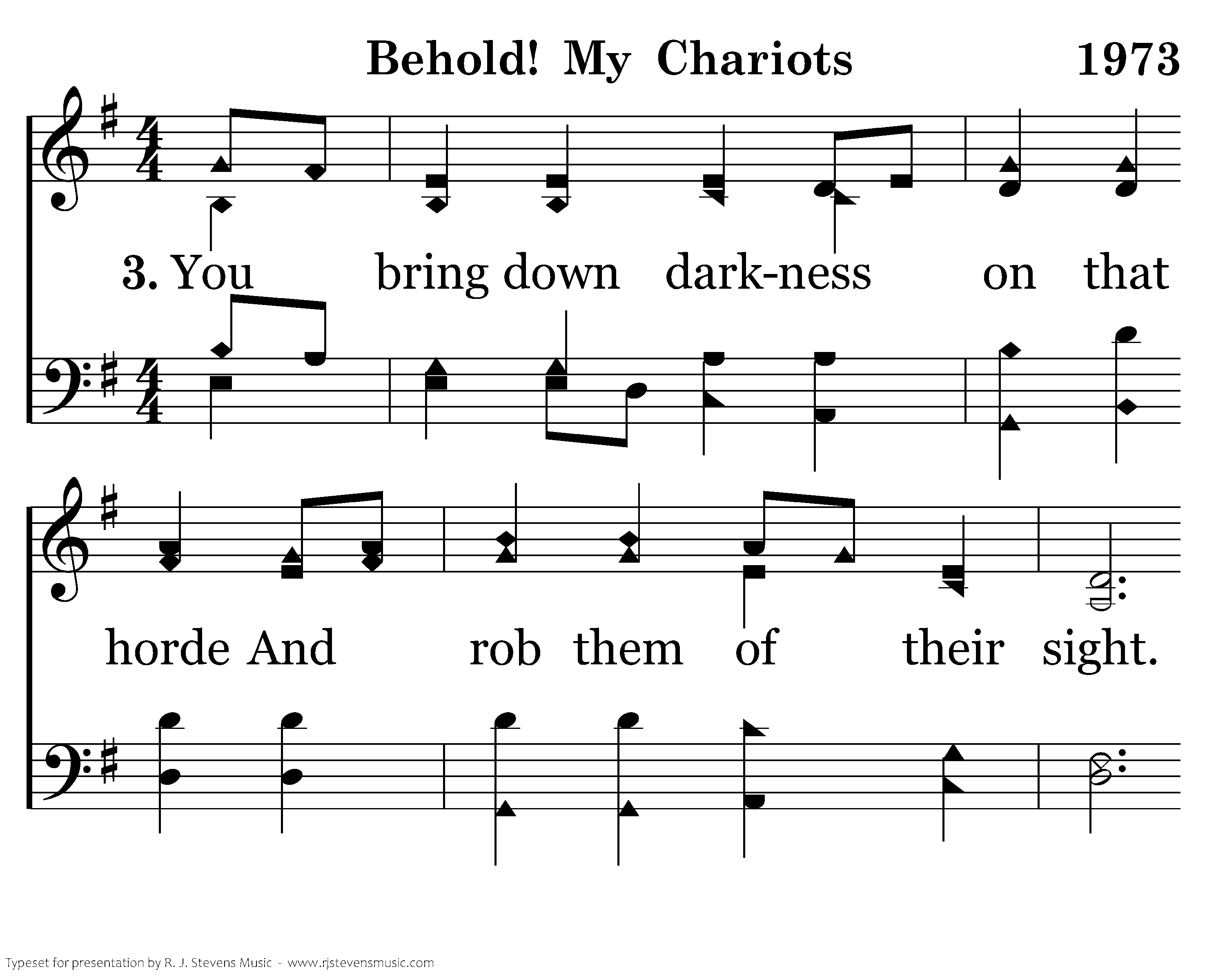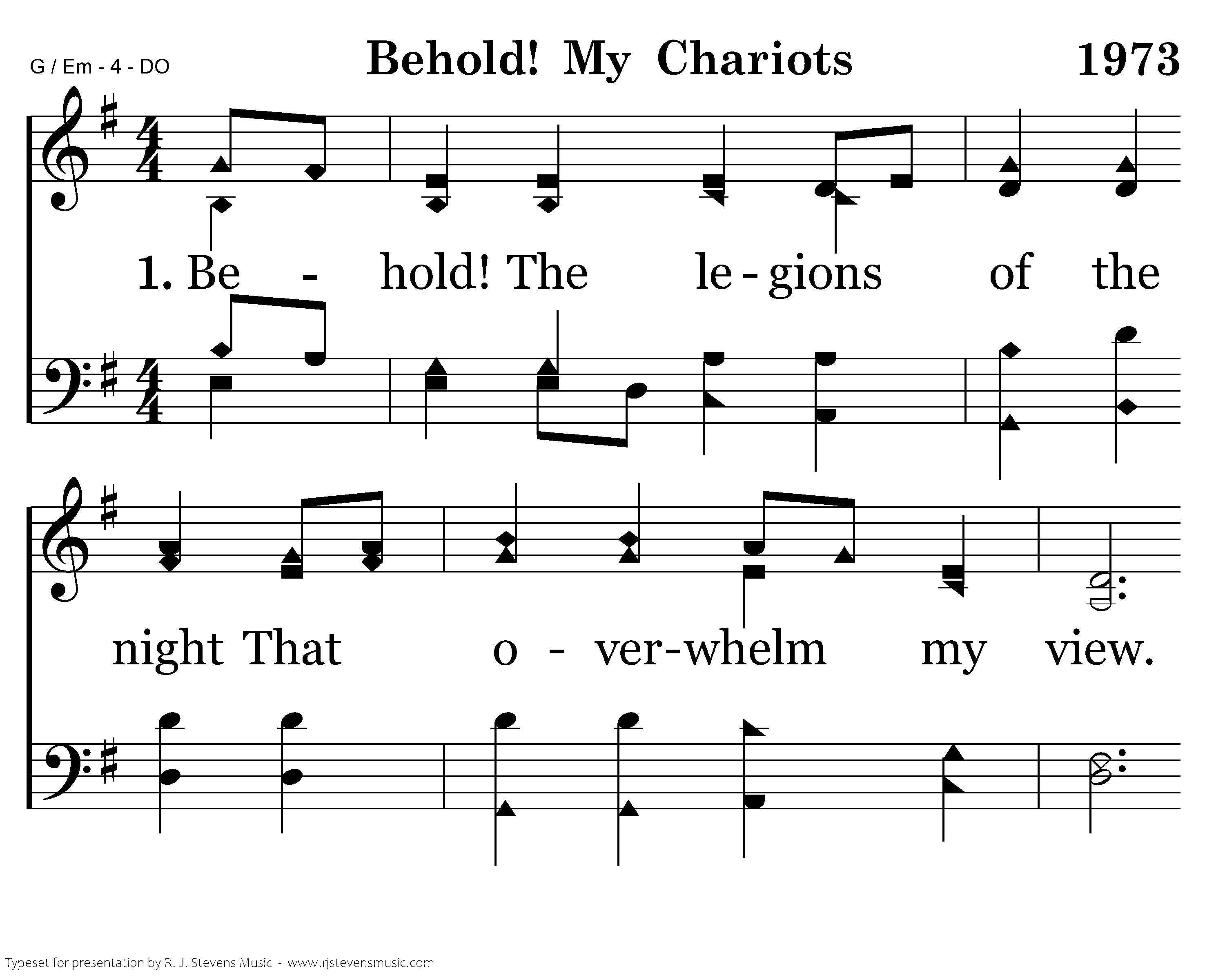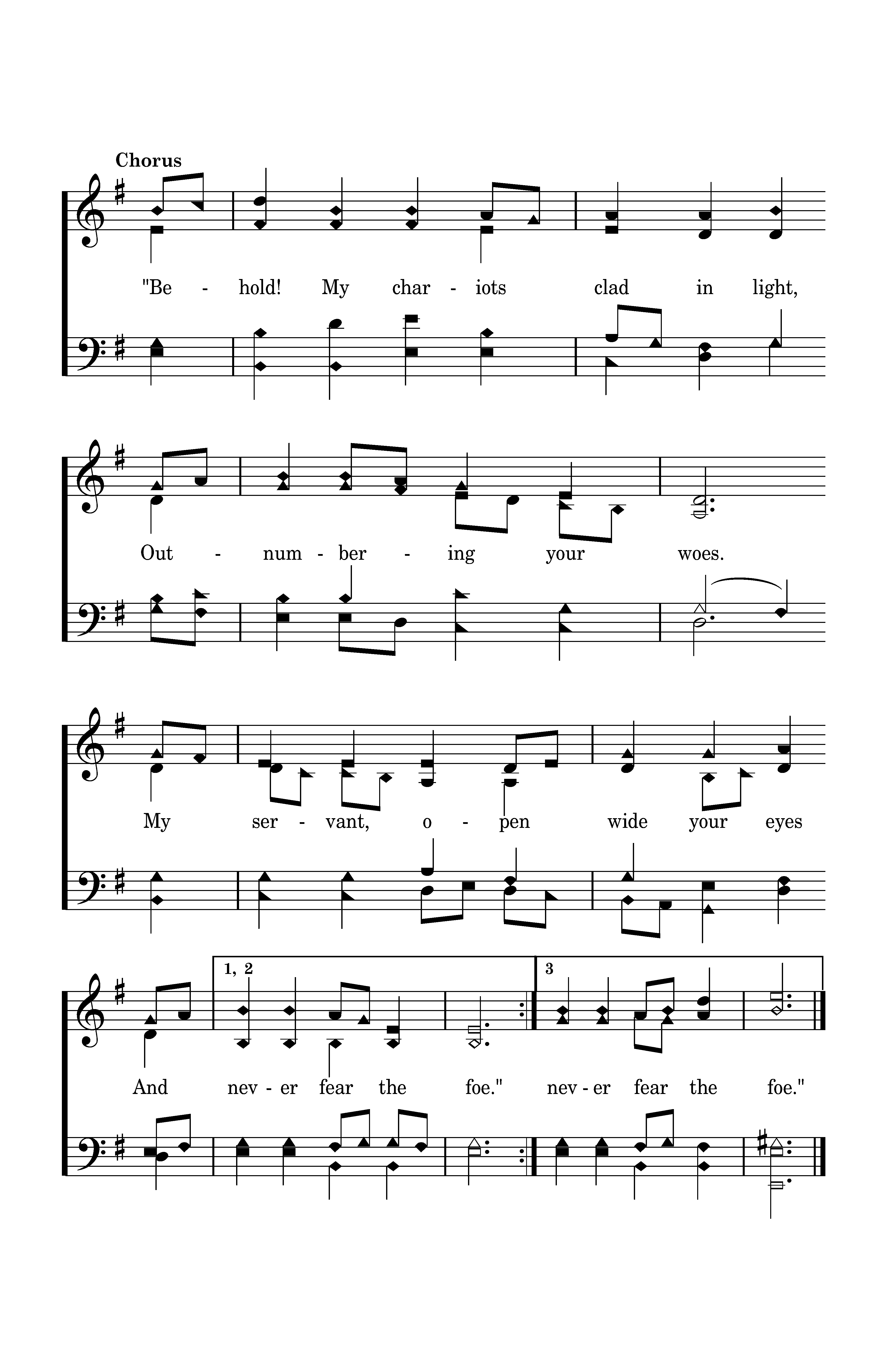 Behold! The legions of the night That overwhelm my view. With no way out, no path for flight, My Lord, what shall I do? "Behold! My chariots clad in light, Outnumbering your woes. My servant, open wide your eyes And never fear the foe."