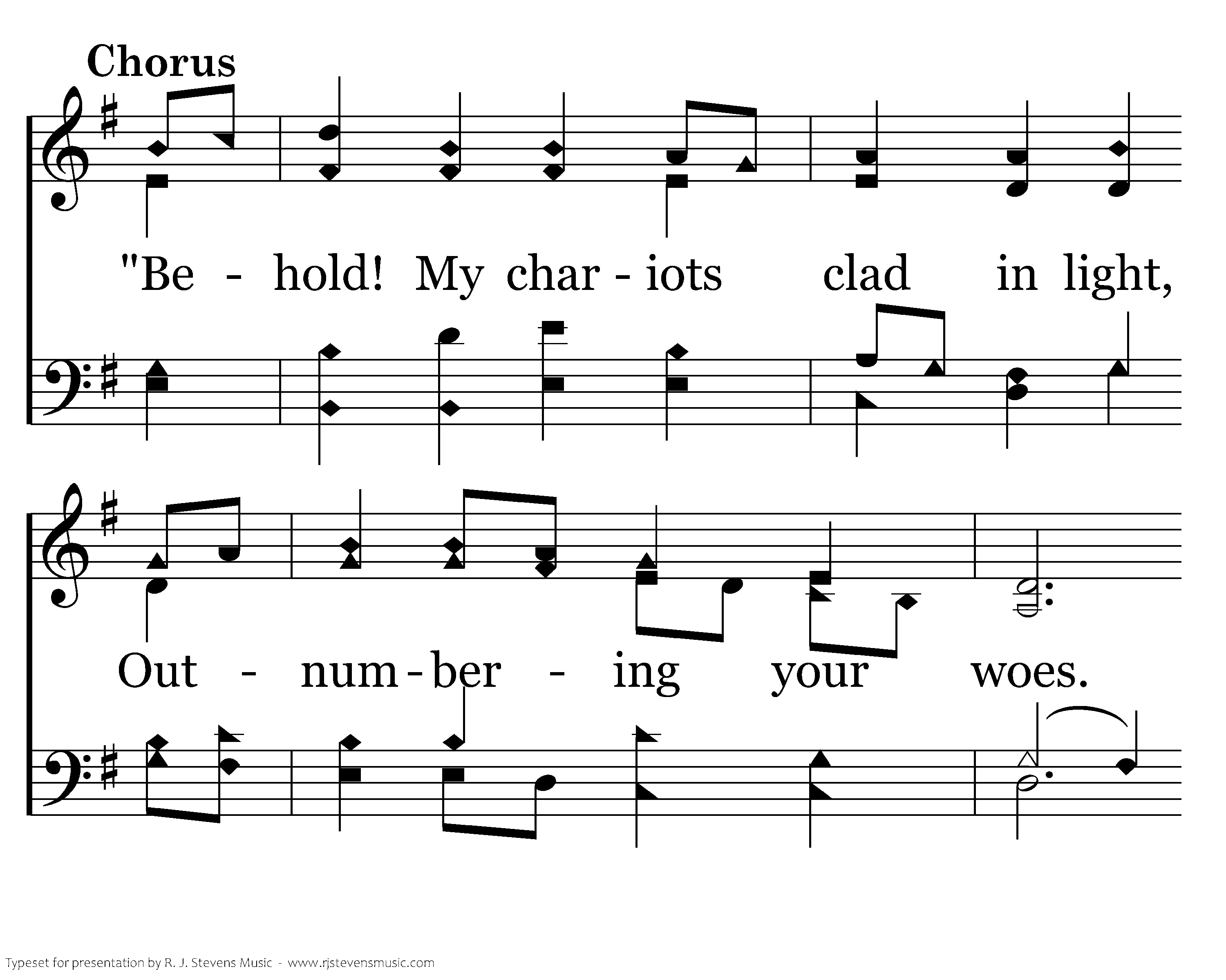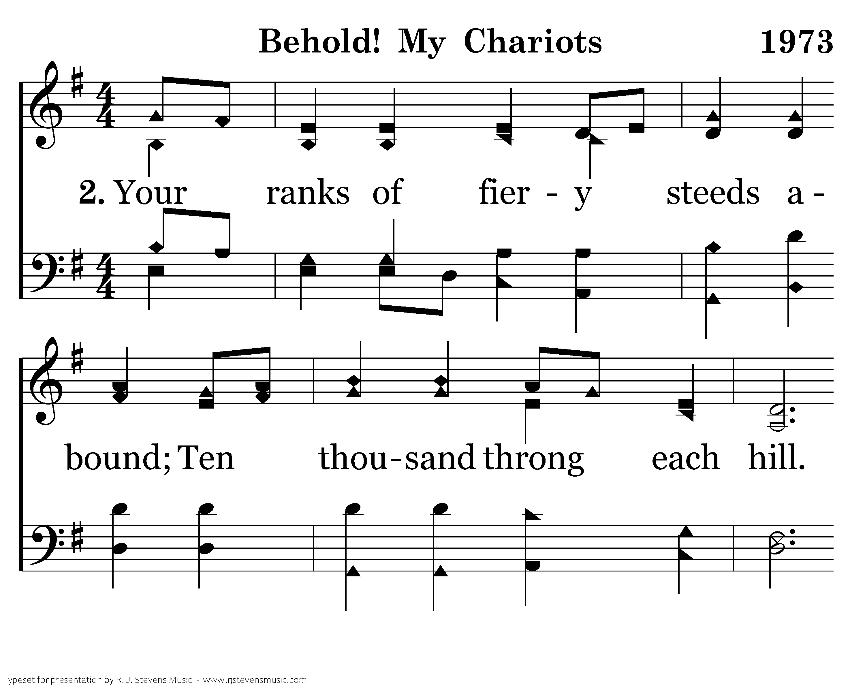 Your ranks of fiery steeds abound; Ten thousand throng each hill. Your unseen army shakes the ground, And now my heart is still. "Behold! My chariots clad in light, Outnumbering your woes. My servant, open wide your eyes And never fear the foe.
