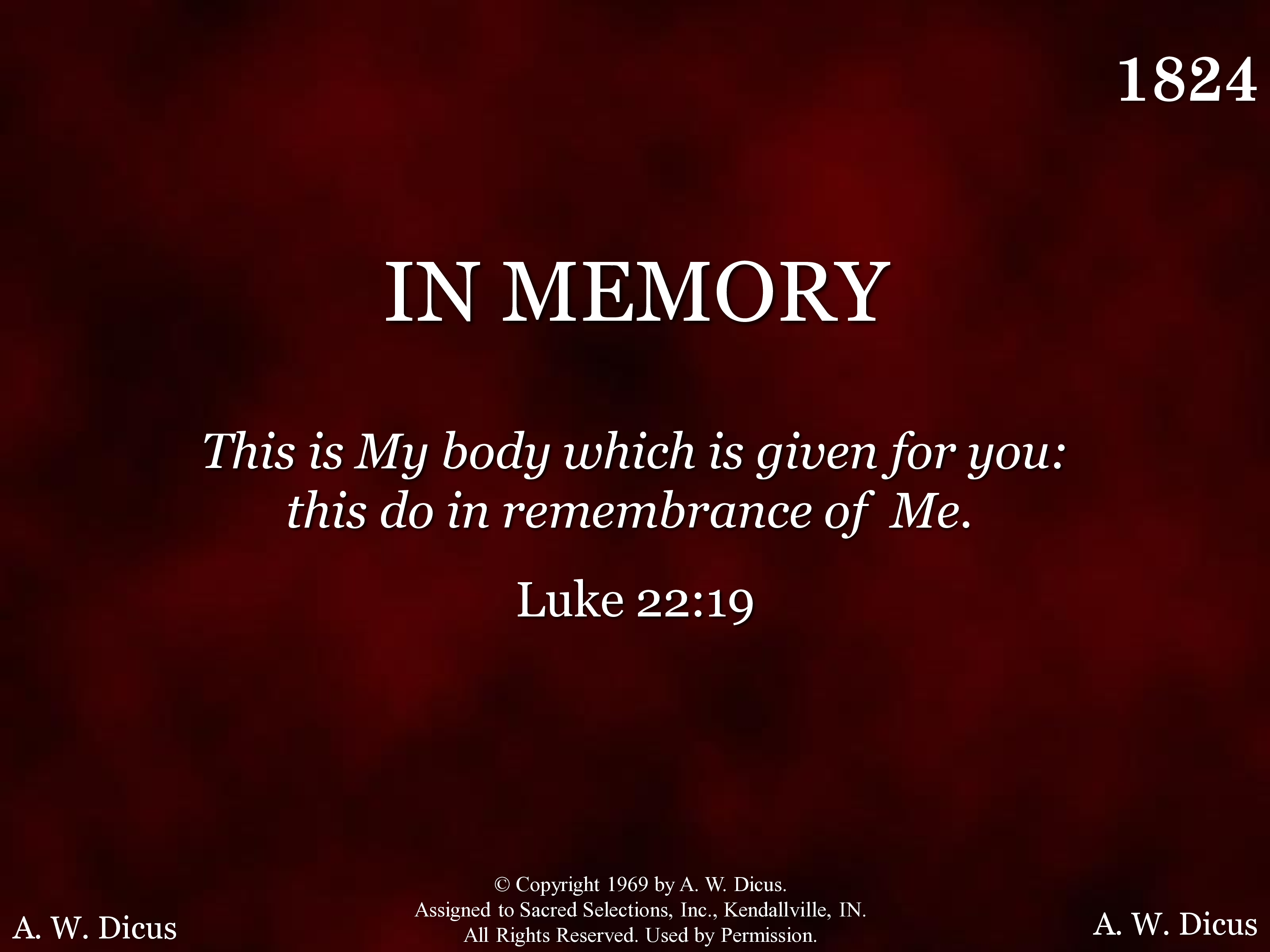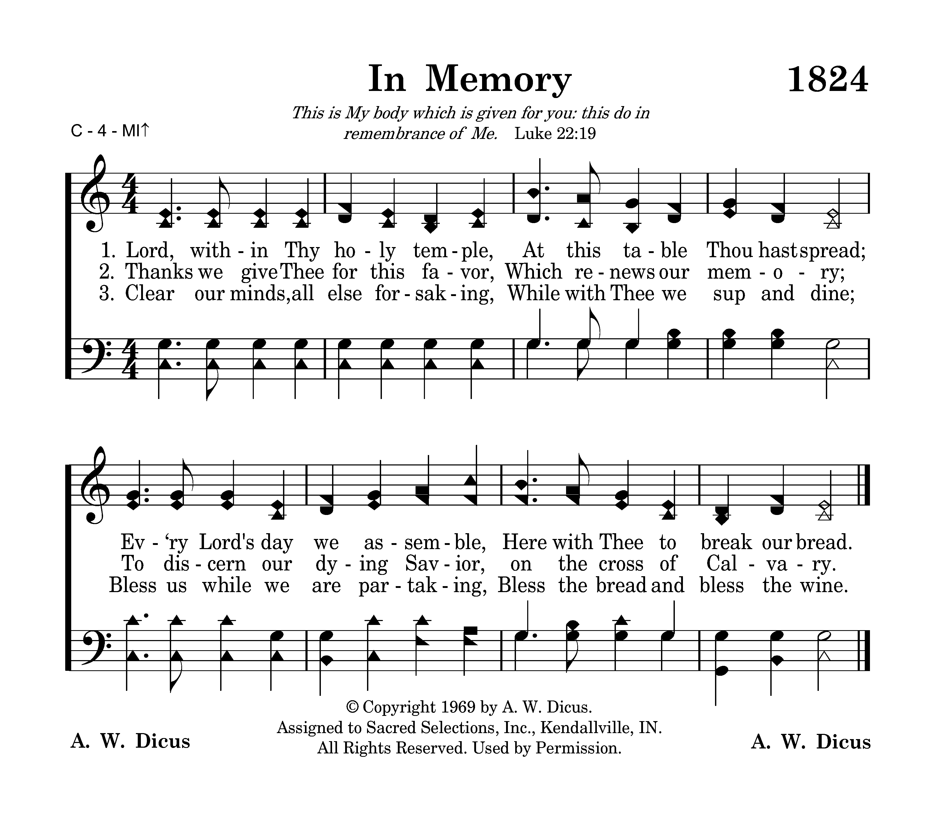 - © Copyright 1969 by A. W. Dicus. Assigned to Sacred Selections, Inc., Kendallville, IN. All Rights Reserved. Used by Permission.