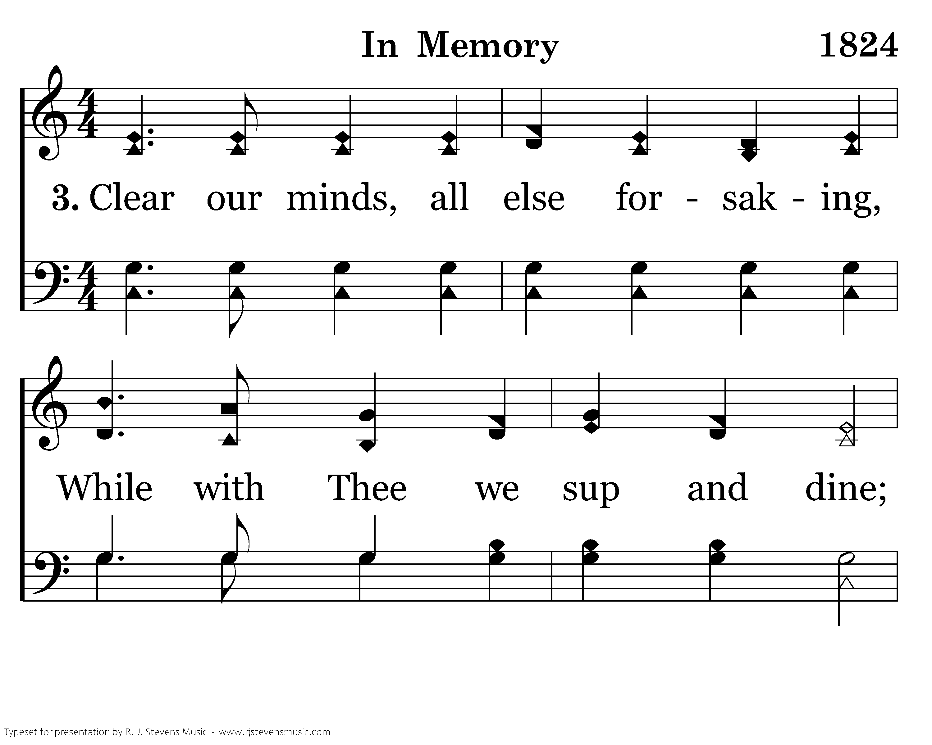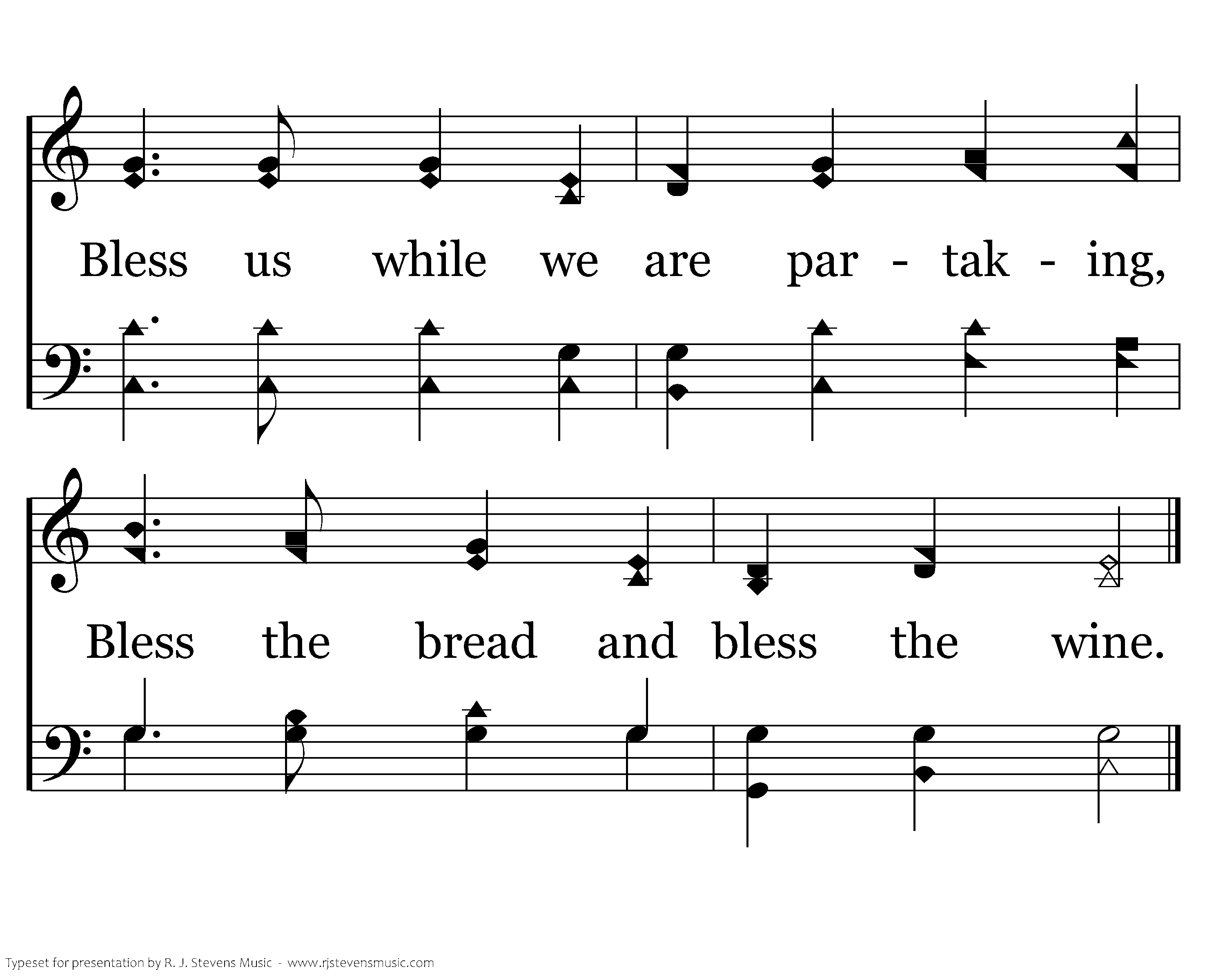 Clear our minds, all else forsaking, While with Thee we sup and dine; Bless us while we are partaking, Bless the bread and bless the wine.