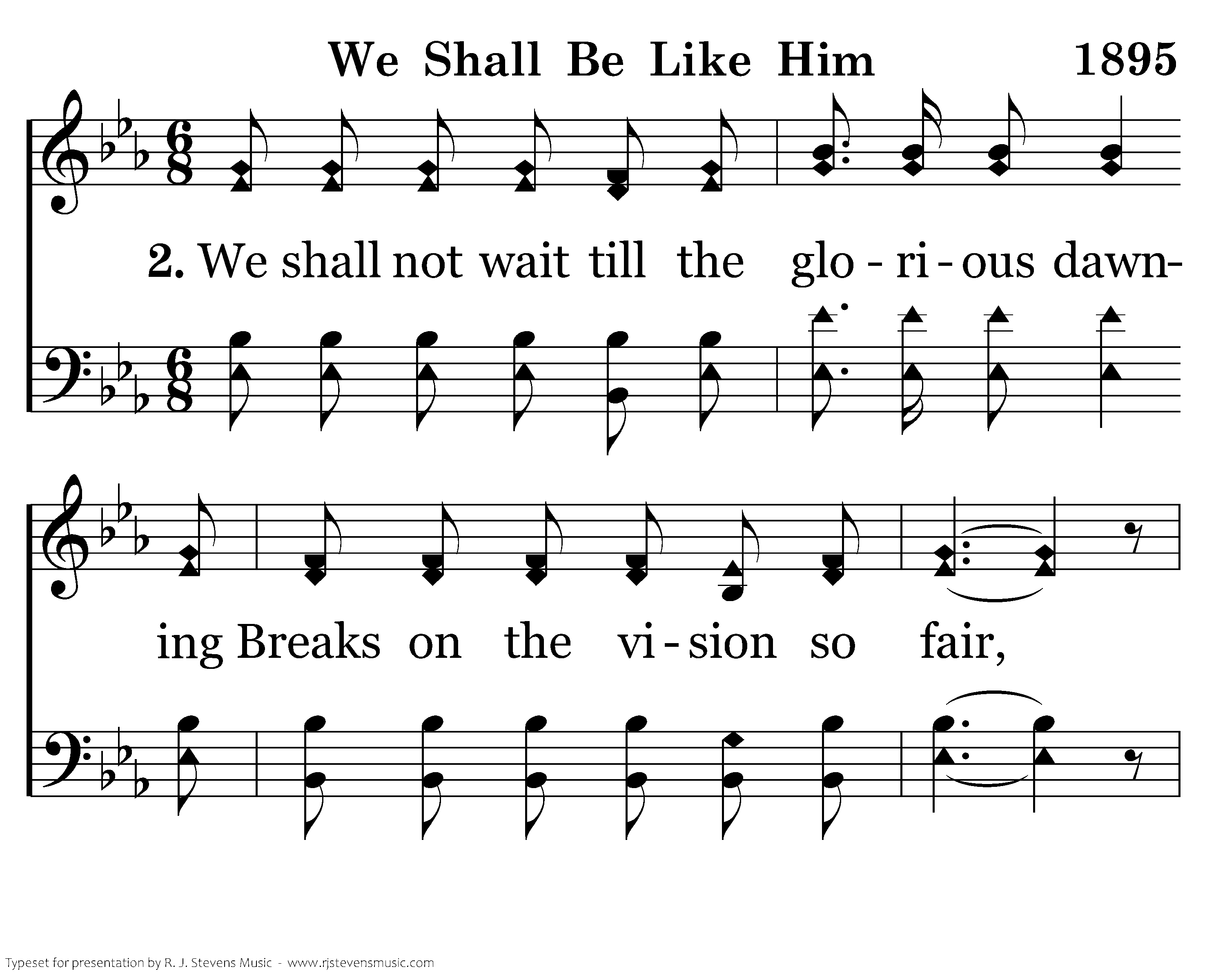 We shall not wait till the glorious dawning Breaks on the vision so fair, Now we may welcome the heavenly morning, Now we His image may bear.